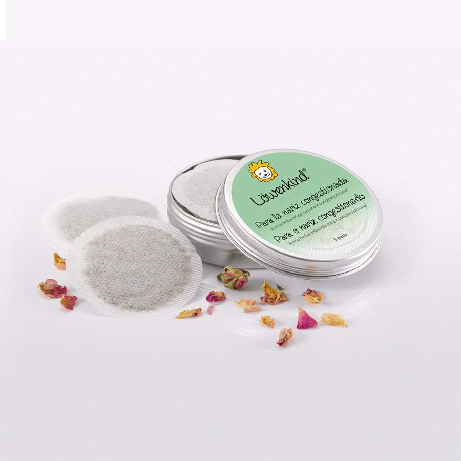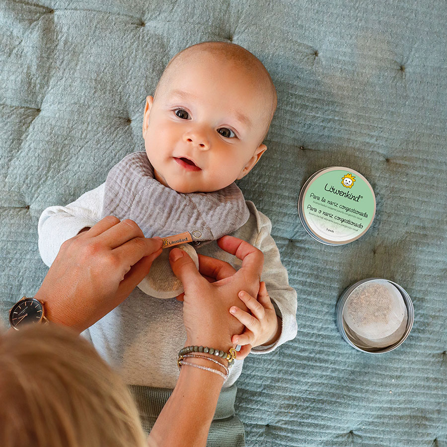 El pad de hierbas se coloca dentro de la bandana Löwenkind®. El calor corporal intensifica el aroma de las hierbas naturales.