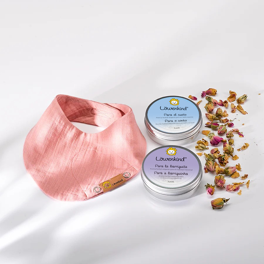 El pad de hierbas se coloca dentro de la bandana Löwenkind®. El calor corporal intensifica el aroma de las hierbas naturales.